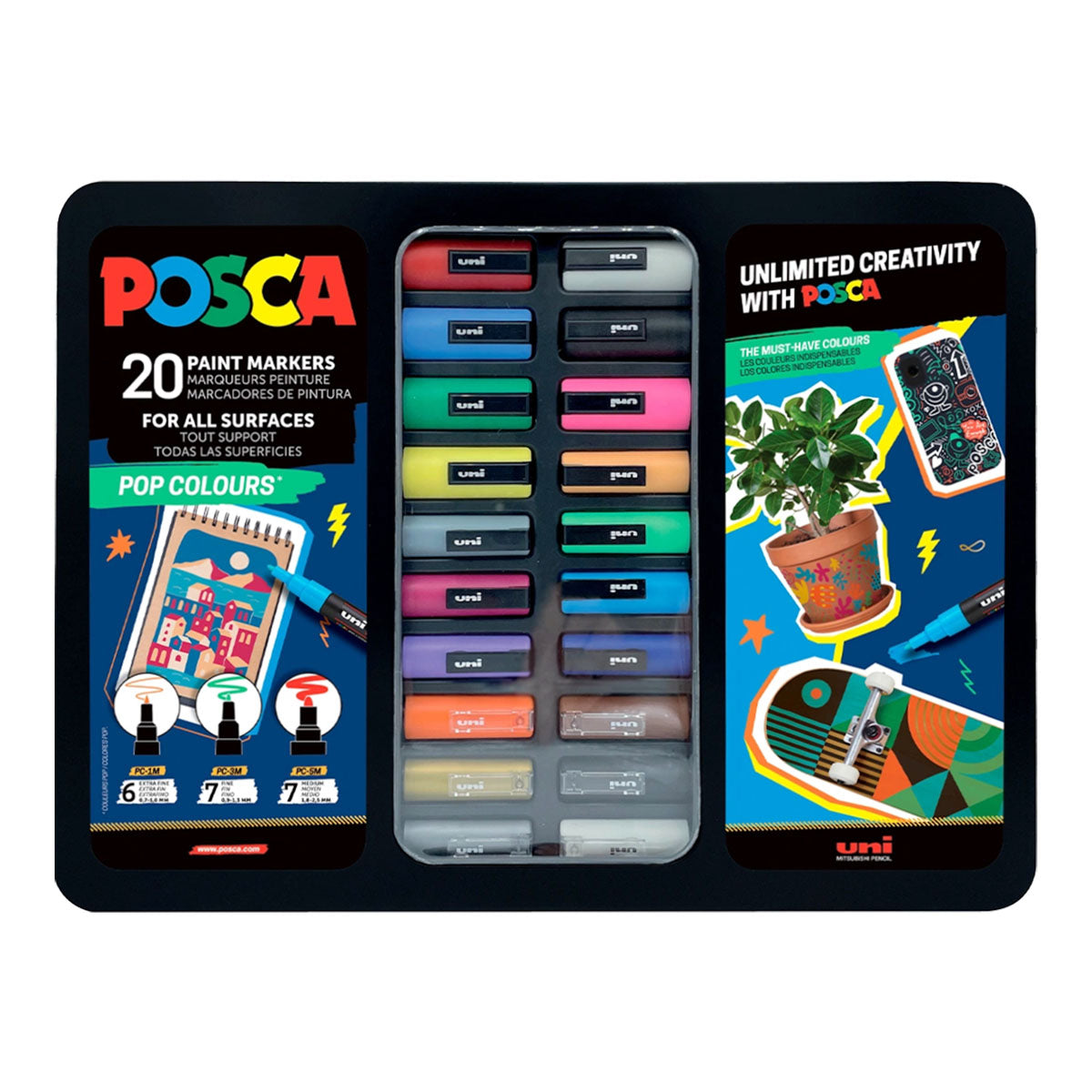 The Uni Posca Markers 20 set Pop Colours brings vibrant, eye-catching shades perfect for bold, expressive work. This energetic collection features 20 bright pop colors with tips ranging from 0.7mm to 2.5mm, giving you the flexibility to create fine details or fill large areas with confident strokes. The water-based acrylic paint flows smoothly across paper, canvas, wood, glass, metal, fabric, and plastic, drying to a vibrant matte finish.