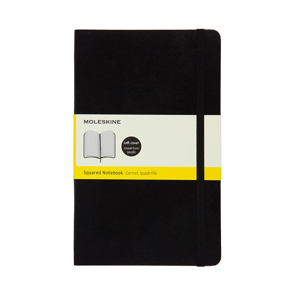 Black Moleskine notebook with 192 squared pages. 70 gram acid-free quality paper. Soft cover and rounded corners makes notebook comfortably to carry in your pocket or bag. Black elastic closure and an inner pocket for storing separate notes. Stylish design with a single-colored cover and discreet Moleskine logo embossed on the back. Moleskines Large notebooks measures 13 x 21 cm.