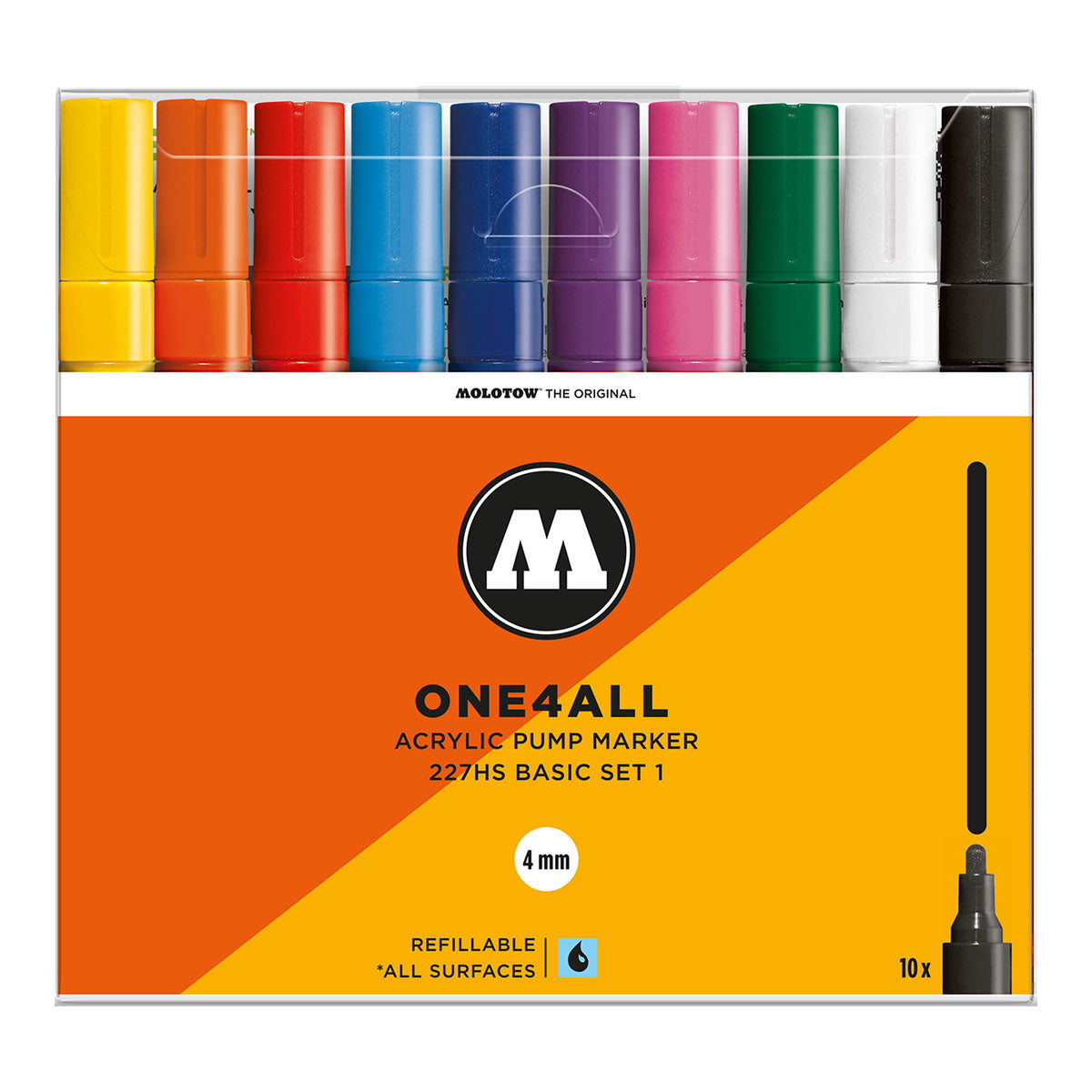 Ten selected basic colors from the Molotow ONE4ALL 227HS Acrylic Marker series. Refillable markers equipped with exchangeable 4 mm round-tip.
