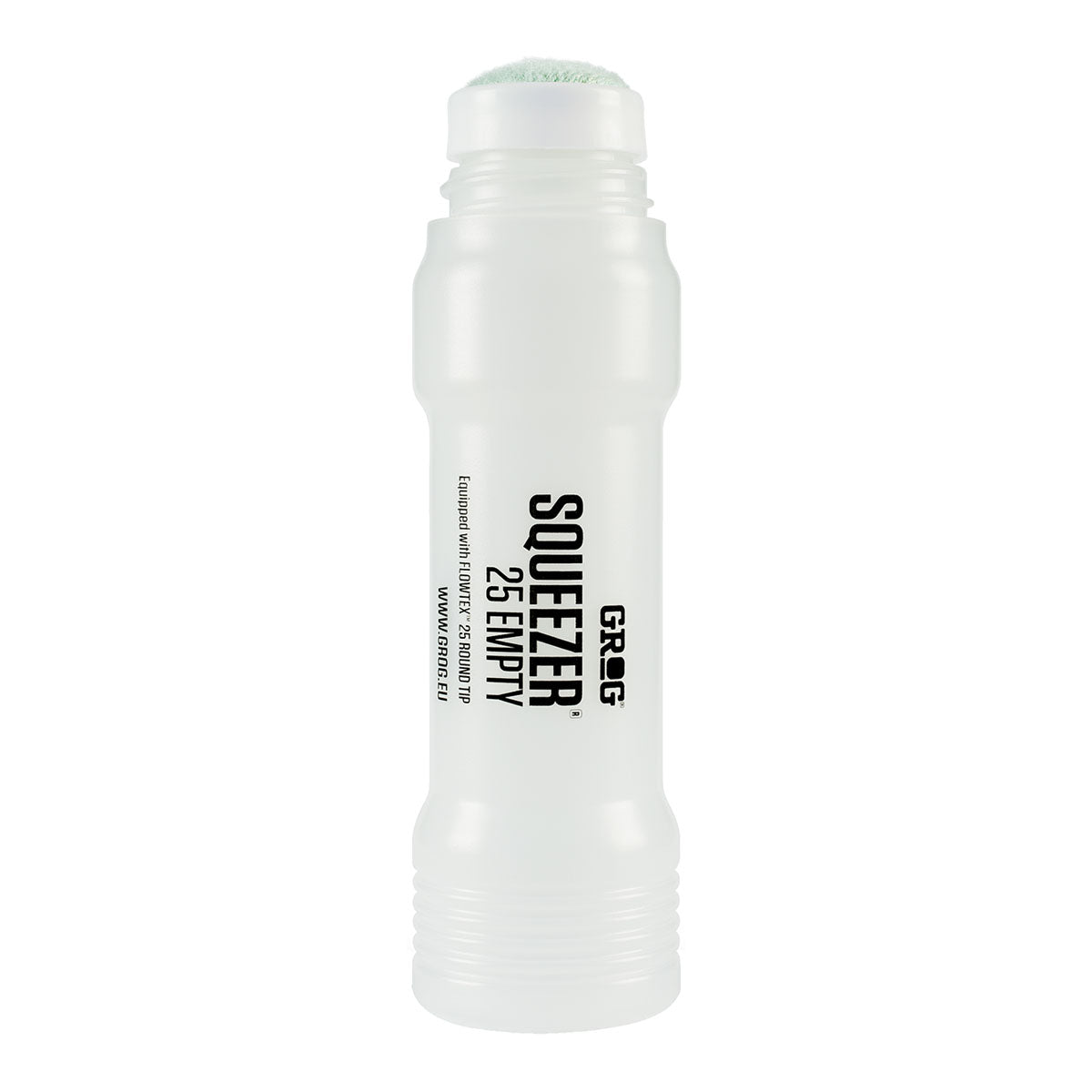 Tom påfyllningsbar squeezable marker från italienska märket Grog. Fyll upp pennan med valfritt bläck eller färg, fungerar bra med båda vatten- och alkoholbaserad färg. När pennan är fylld kontrollerar du enkelt flödet av färg genom att klämma på den mjuka pennkroppen. Pennan har en 25 mm Flowtex udd och extra udder kan även köpas löst. Linjebredd: 25 mm.
