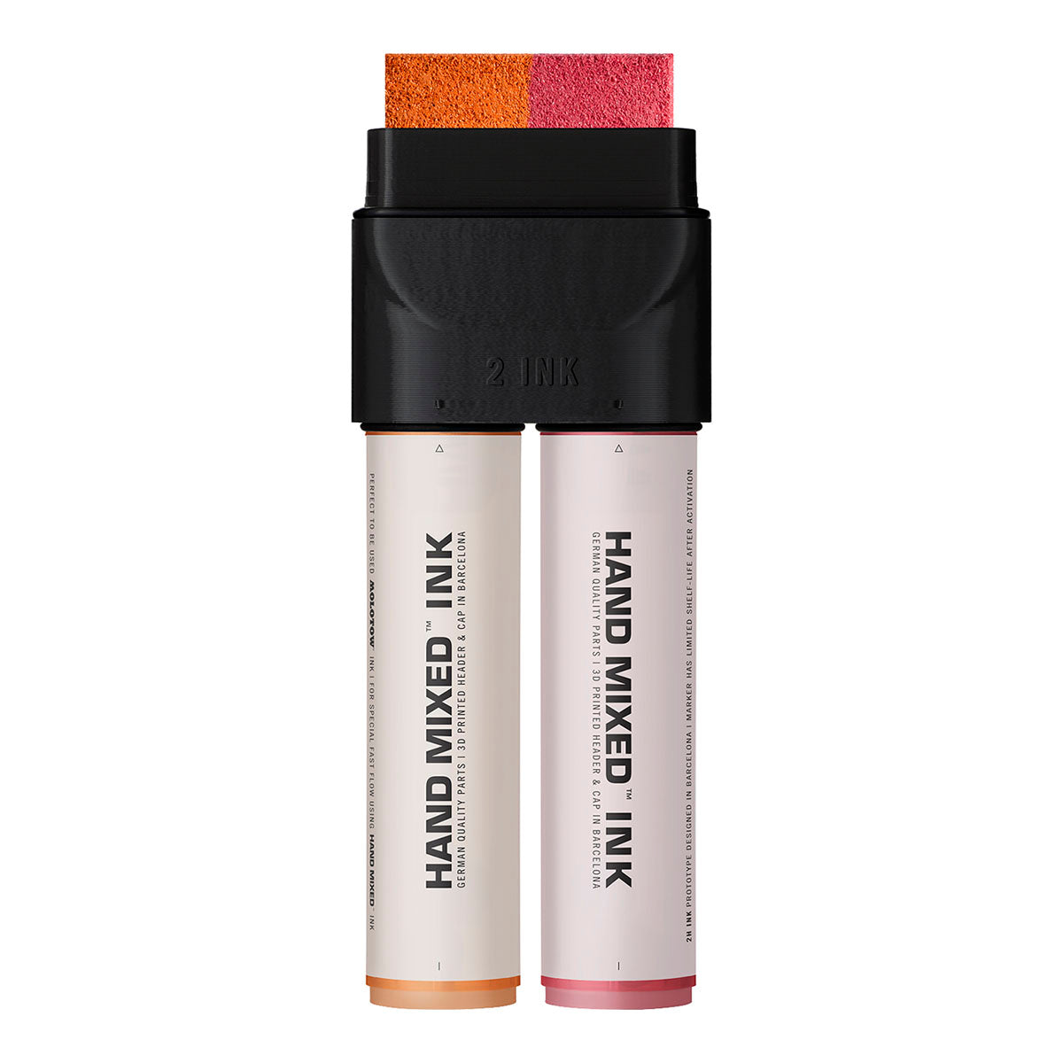 Världens första pump-marker som skriver med två färger samtidigt. Pennorna är designade och utvecklade av HAND MIXED Labs i Barcelona och producerade i samarbete med tyska Molotow. Denna penna kommer fylld med två olika färger som du kan se på bilden. Färgen är permanent alkoholbaserad lackfärg som har en blank finish när den torkat. Se hela vårt sortiment av pennor och produkter från HAND MIXED här.