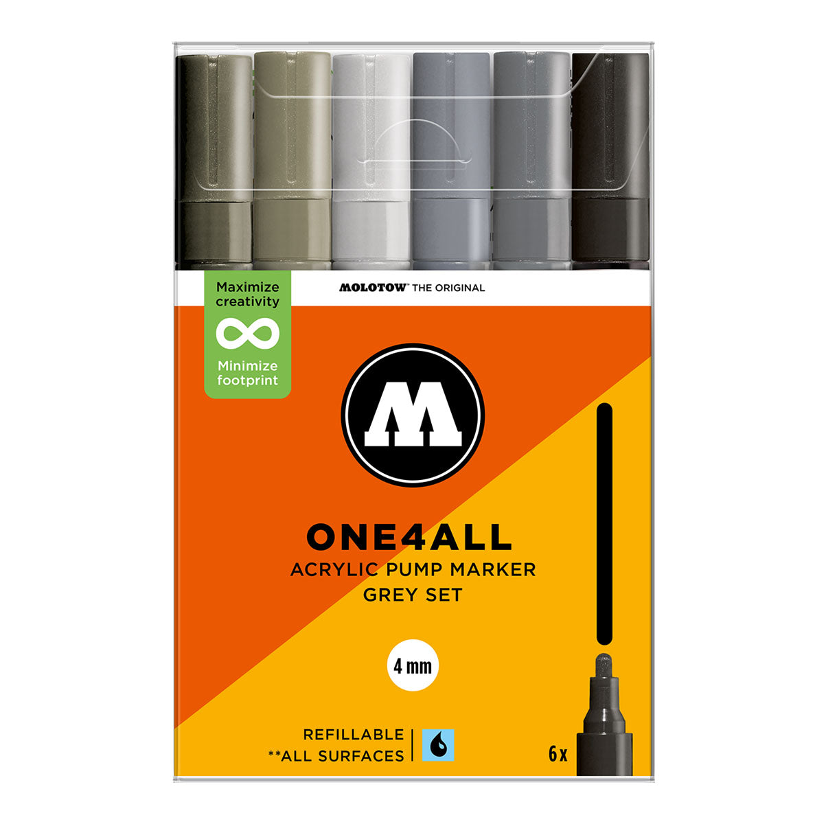 Påfyllningsbara akrylpennor med en 4 mm utbytbar udd. Komplettera gärna ditt pack genom att köpa enstaka Molotow One4All 227HS Markers.