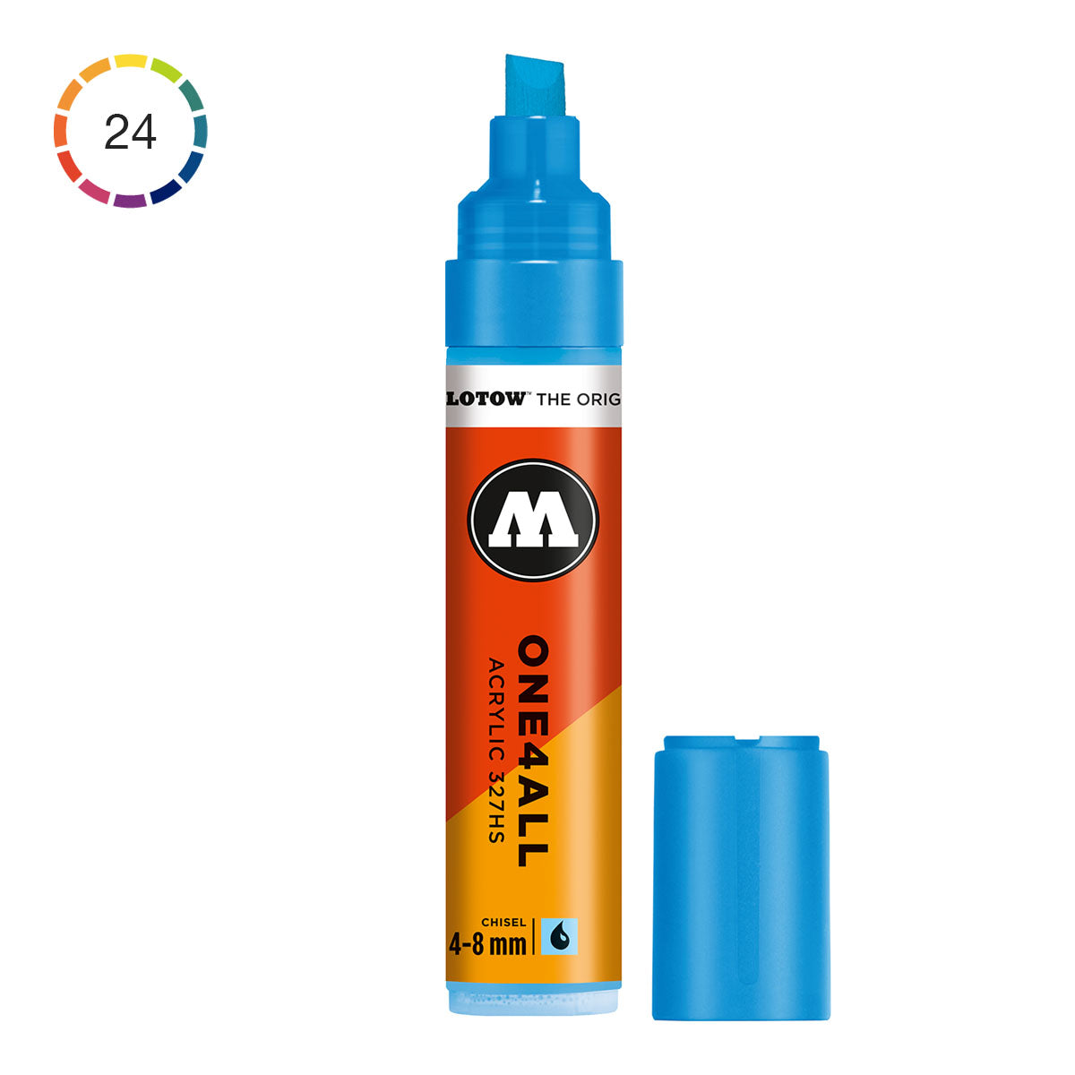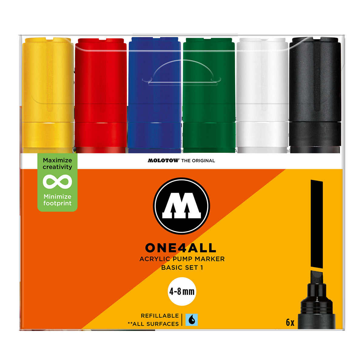 Påfyllningsbara akrylpennor med en 4-8 mm utbytbar udd. Komplettera gärna ditt pack genom att köpa enstaka Molotow One4All 227HS Markers.