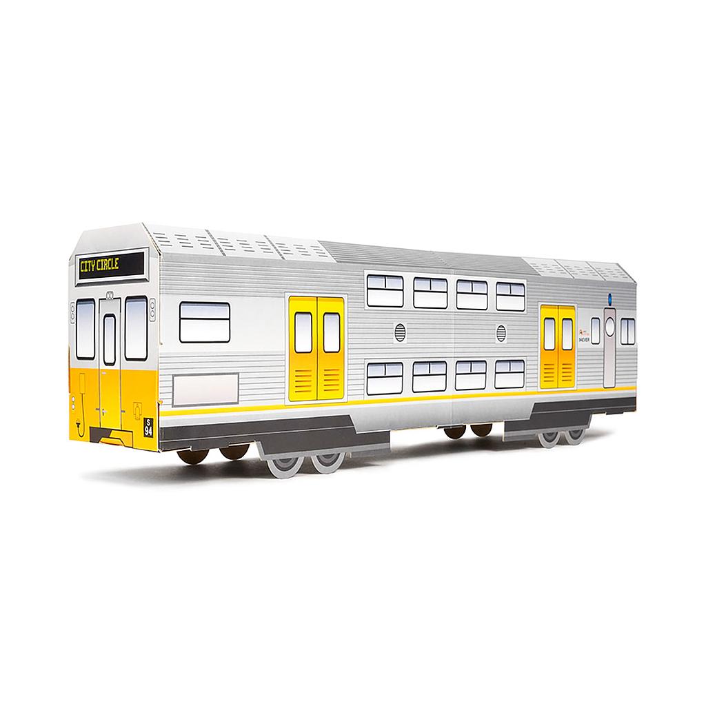 Replika av Sydneys dubbeldäckartåg i kartong som du kan kan måla på och sen vika ihop till en 3D-modell. Du kan måla eller teckna med i stort sett alla typ av pennor eftersom tåget är tillverkat i kartong men vi rekommenderar vattenbaserad akrylpennor. Modellen blir cirka 43 cm x 10 cm x 9 cm när den är ihopvikt.